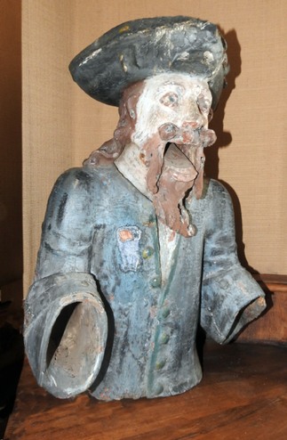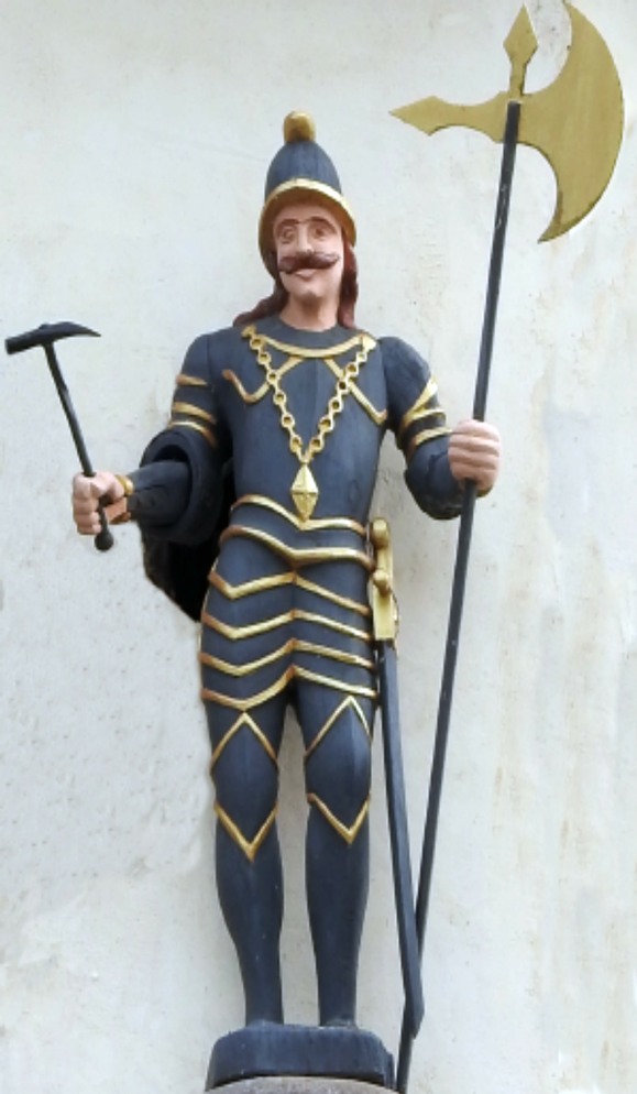 Le buste du personnage placé dans une ouverture du clocher à bulbe, se nomme Justitien,