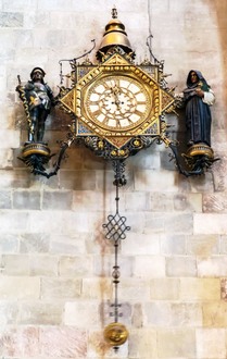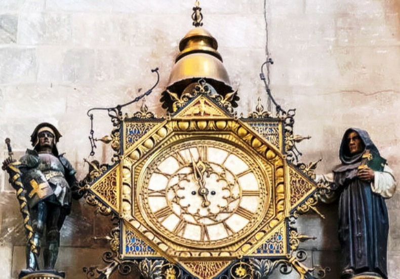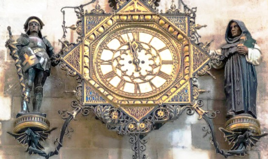 L’homme d’arme et le religieux sonnent les heures et les demies en actionnant les marteaux au bout des tiges courbées, sur les cymbales de l’horloge intérieure.