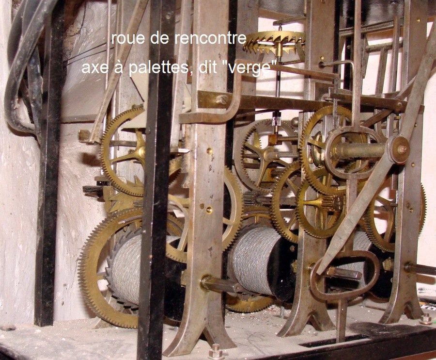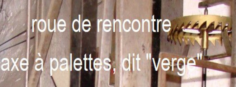 L’axe à palettes, appelé la verge, est actionné par une roue de rencontre en dents de scie, afin de redonner l’impulsion au balancier qui, de ce fait, assure la régularité des battements.