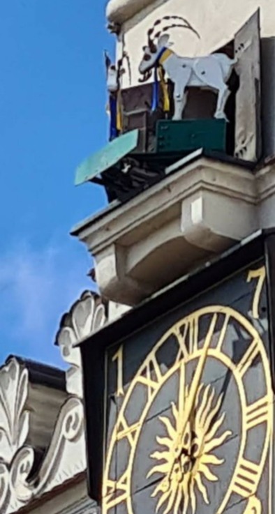 deux chèvres à l'horloge de la tour de l'hôtel de ville. Inspiré d'une légende locale, il évoque un cuisinier distrait dont le repas brûlé poussa