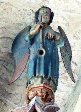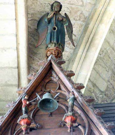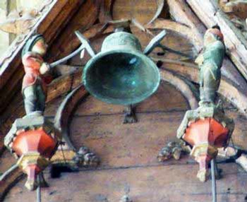 Dans l'ogive, une cloche frappée chaque heure par deux jacquemarts, alors que l'ange du sommet agite la tête.