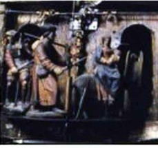 Marie et Joseph fuyant en Egypte, précédés par un ange et poursuivis par deux sbires d'Hérode