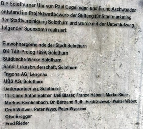 L’horloge de Soleure de Paul Gugelmann et Bruno Aschwanden a été créée dans le cadre du concours de projets de la rigidung für stadtmarketing de la Stadtvereinignung Soleur et a été réalisée avec le soutien des sponsors suivants: