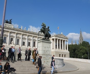 Dans la rue Hoher Markt, entre la cathédrale Saint-Stéphane (Stephansdom) et la synagogue (Stadttempel).