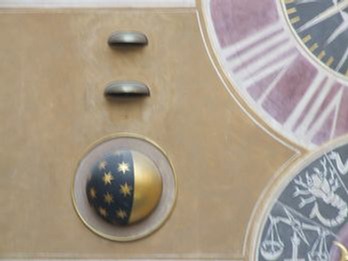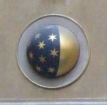 Sur la gauche, une boule bleue, mi-or mi-étoilée, donne les phases de la lune.