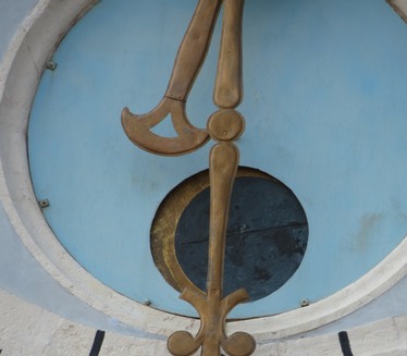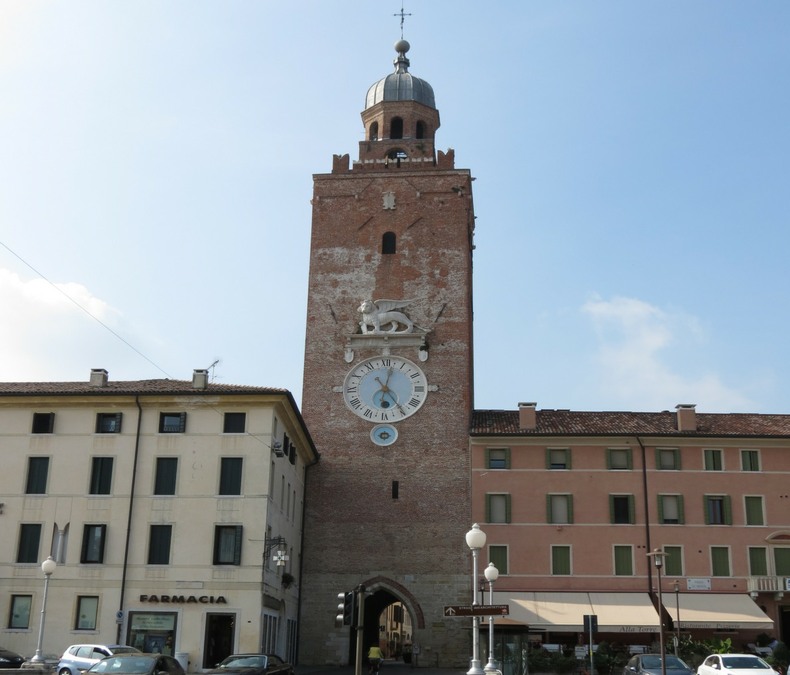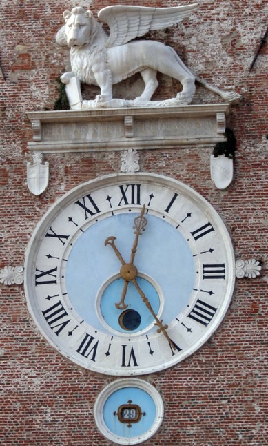 Dans la tour avant comporte à l'extérieur le grand cadran d'horloge bleue, surmontée par le lion de San Marco avec un livre ouvert (symbole de paix), voulu par le maire Pietro Gradenigo en 1499.
