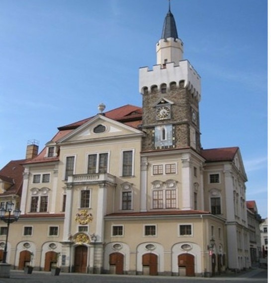 Après les travaux de restauration en 1993, le Hall Löbau montre une tour harmonieussemnt refaite et met en valeur son horloge à lune.