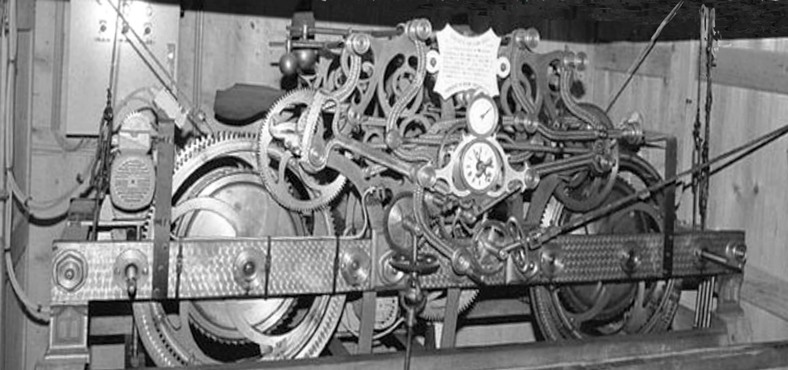 Ce dernier inclut une sonnerie des heures, des quarts et trois cadrans de deux mètres visibles. Actuellement, le mouvement est équipé de moteurs de remontage électrique.