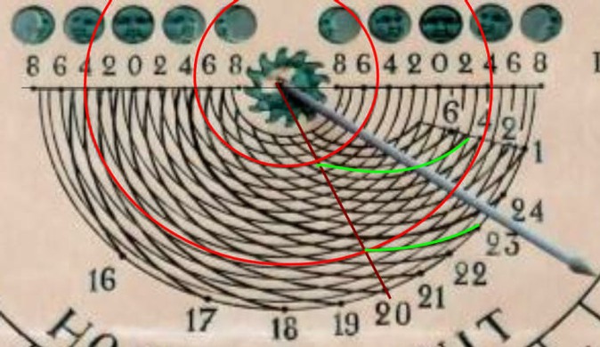 Pour trouver l'heure solaire, on suit le cercle qui correspond à la phase de la lune jusqu'à l'ombre du style, puis on parcourt l'arc de cercle qui indique l'heure en chiffres Arabe.