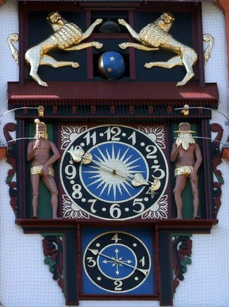Deux lions frappent le quart d'heure, et deux personnages s’animent quand l'horloge sonne les heures