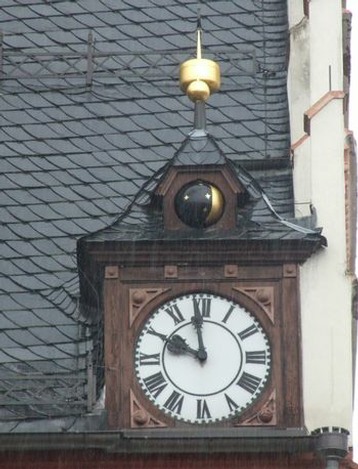 Sur un angle à droite du grand escalier de l’hôtel de ville, un chien assis protège un cadran aux chiffres romain.