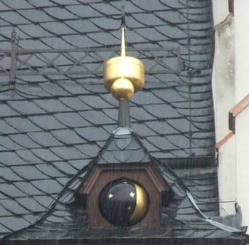 Au-dessus, une lune étoilée donne les phases aux passants qui lèvent la tête.