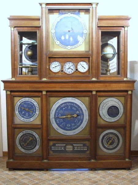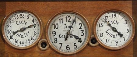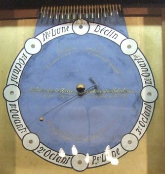 Le cadran supérieur, bleu avec des boules blanches, donne la position angulaire de la lune par rapport à la terre et au soleil et montre les phases.