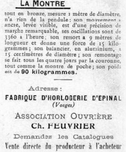 Réalisée par Louis Siron, horloger à Seloncourt et qui fut présentée à l’exposition de Nancy le 18 juillet 1909.