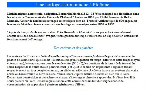 Petit bijou de la cité historique, une horloge astronomique datant de 1855 et toujours en état de marche. Dix cadrans sur une face, un système planétaire sur l'autre, elle a été réalisée par le frère Bernardin (de son vrai nom Gabriel Morin), de la congrégation des Frères de l'instruction chrétienne de Ploërmel. On la découvre dans la cour de la maison mère des Frères (1, bd Foch). Seul ou avec un frère qui expliquera son mécanisme (c'est gratuit, mais prévenez de votre visite).
