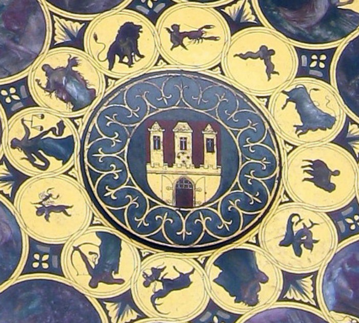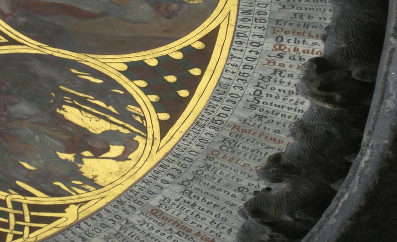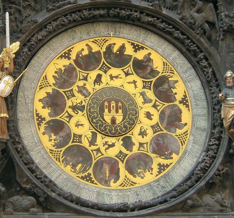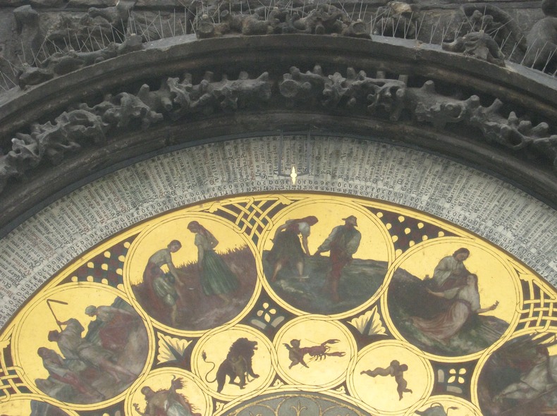 Le centre figure les armoiries de la Vieille Ville de Prague et le cercle intérieur représente les signes du zodiaque. Sur le cercle suivant des scènes de la vie paysanne en Bohême symbolisent les mois de l'année. L'extérieur indique les jours de l'année.