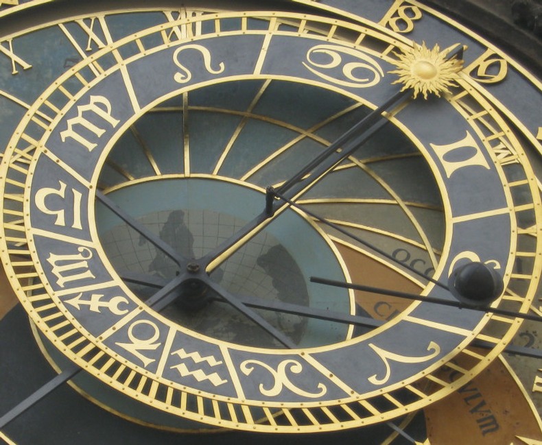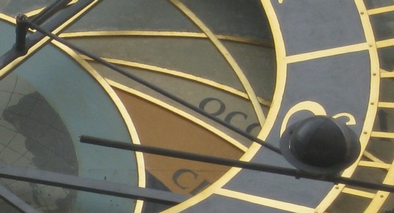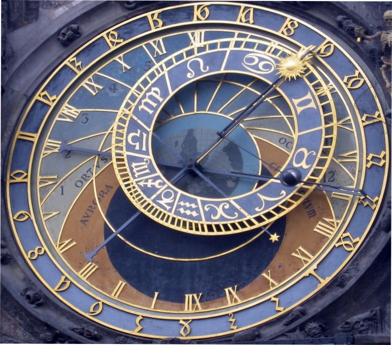 La position de la main d'or sur la bague extérieure indique les heures passées après le coucher du soleil dans le Vieux Temps tchèque.