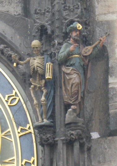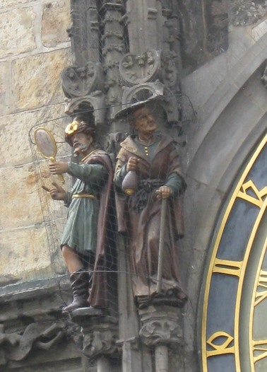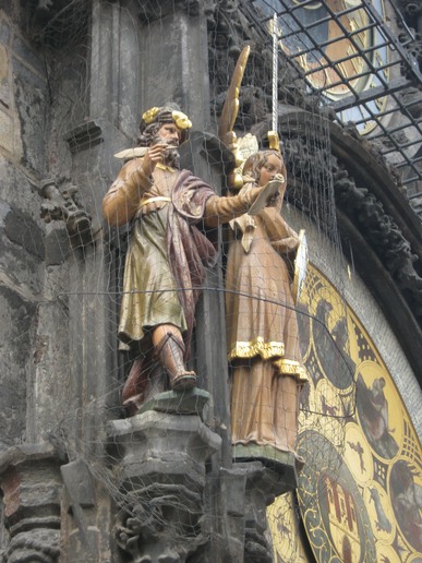 Au XVII° apparition des figurines animées et des apôtres. Josef Manes réalisa de nouveaux disques calendaires au dix-neuvième siècle. Gravement endommagée le 8. mai 1945, l'horloge a été restaurée depuis. Elle possède encore les trois quarts de ses pièces d’origine.