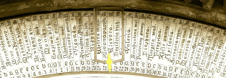 Situé en bas de l'horloge, Il s'agit d'un calendrier réalisé en 1866 par J. Manes qui permet de connaître le jour de l'année. Les dates sont inscrites sur l'extérieur du disque et défilent très lentement face à un stylet fixe.